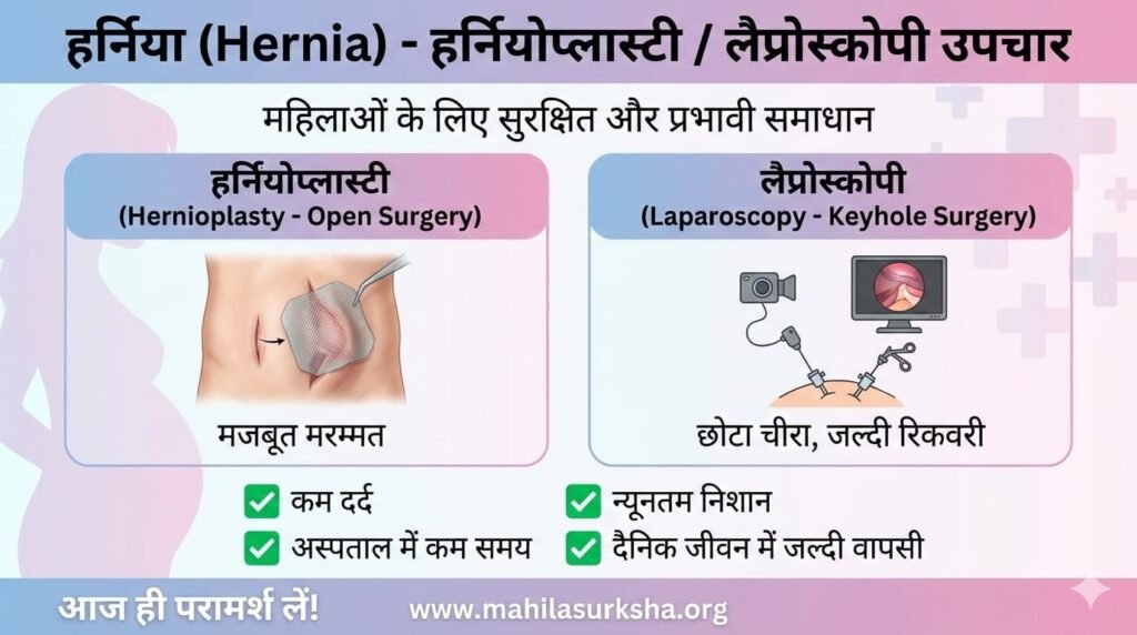 हर्नियोप्लास्टी या लैप्रोस्कोपी के जरिए कमजोर मांसपेशियों को जाली (Mesh) लगाकर ठीक किया जाता है।
